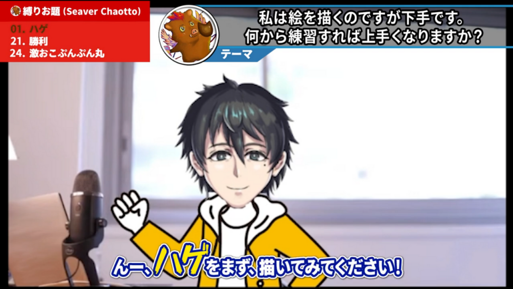 僕らの動画で出てるお題をそのまま使うか、実際に過去にあったスパチャから選んでくると楽かなと思います。